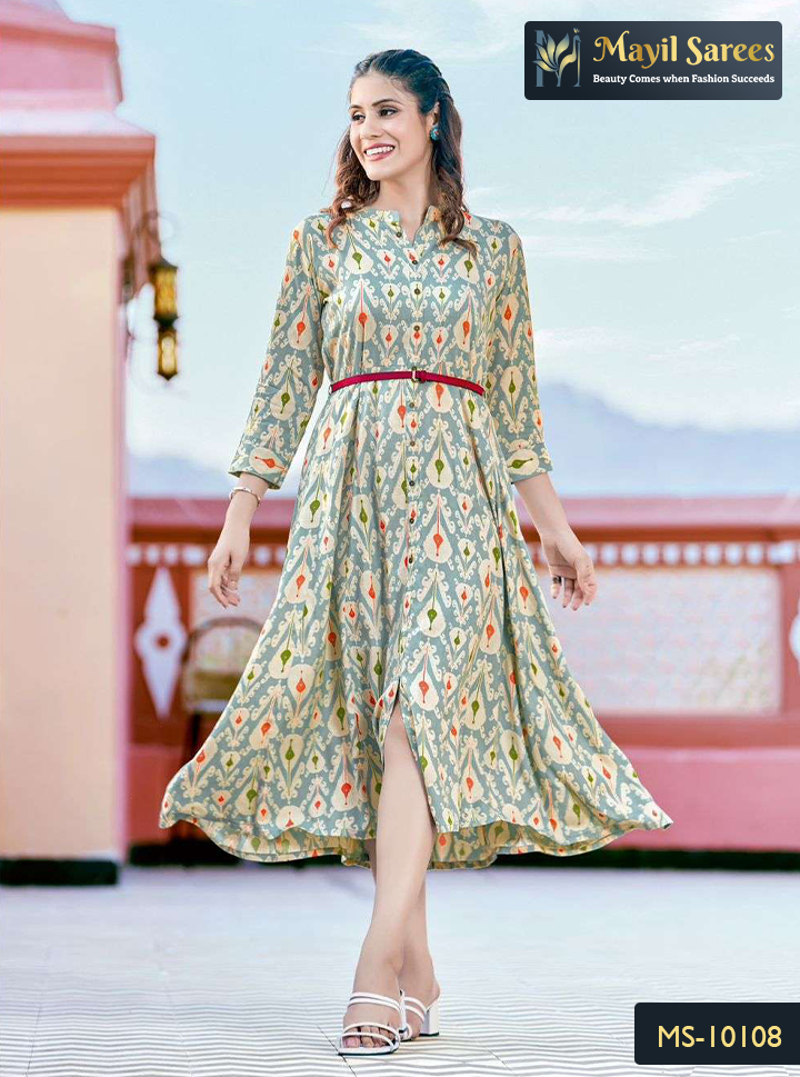 Light Grey Printed Front Open Fancy Stitch Kurti with Belt
