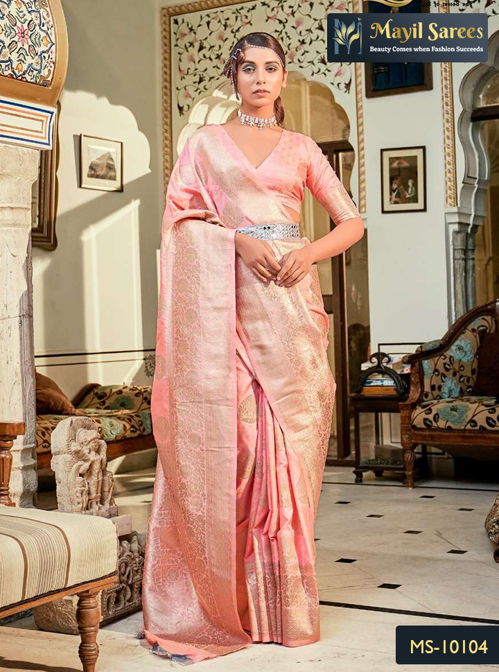 Elevate your ethnic charm with our exquisite Banarasi Butta Silk Sarees, adorned with intricate Zari weaving. The rich Banarasi silk fabric drapes gracefully, while the mesmerizing Zari weaving adds a touch of opulence. Whether you're attending a wedding or celebrating a special occasion, these sarees are your perfect choice.